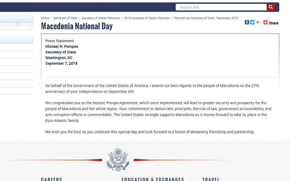 Στην «ιστορική συμφωνία των Πρεσπών» αναφέρεται δήλωση του Αμερικανού υπουργού Εξωτερικών, Μάικ Πομπέο, που έγινε με αφορμή την 27η επέτειο της ανεξαρτησίας της πρώην Γιουγκοσλαβικής Δημοκρατίας της Μακεδονίας.