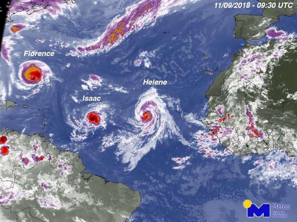 Ο τυφώνας Κατηγορίας 4 «Florence» κατευθύνεται προς τις ακτές των ΗΠΑ μέχρι το τέλος της εβδομάδας, η τροπική καταιγίδα«Isaac» κινείται γρήγορα προς την Καραϊβική και αναμένεται να αναβαθμιστεί σε τυφώνα μέχρι το πρωί της Τετάρτης 12/09, και ο τυφώνας Κατηγορίας 2 «Helene» βρίσκεται δυτικά των Κανάριων Νήσων και αναμένεται να κινηθεί βόρεια χωρίς να απειλεί άμεσα κατοικημένες περιοχές.