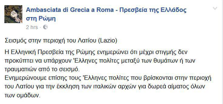 Όπως ενημερώνει η ελληνική πρεσβεία στη Ρώμη με μήνυμά της στο Facebook, μέχρι στιγμής δεν προκύπτει να υπάρχουν Έλληνες πολίτες μεταξύ των θυμάτων ή των τραυματιών από το σεισμό.