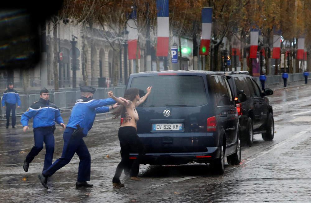 Δύο γυμνόστηθες διαδηλώτριες της οργάνωσης Femen παραβίασαν τα μέτρα ασφαλείας και έτρεξαν προς την αυτοκινητοπομπή του Αμερικανού προέδρου Ντόναλντ Τραμπ στο Παρίσι. Άμεσα συνελήφθησαν από την αστυνομία.