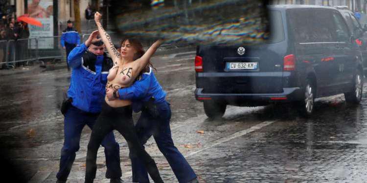 INTRUSION : Des Femen viennent de faire irruption en plein milieu des Champs-Élysées au passage du cortège de Donald Trump. #11Novembre #ArmisticeDay100 pic.twitter.com/CPp0aJqwLj