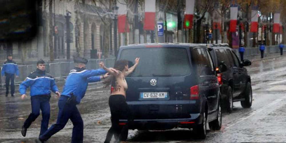 Το Σάββατο (10/11) τρεις γυναίκες μέλη της Femen είχαν εμφανιστεί για λίγο κάτω από την Αψίδα του Θριάμβου με γυμνά στήθη και υψωμένες γροθιές, φωνάζοντας «Welcome war criminals» (Καλωσήρθατε εγκληματίες πολέμου). Στα στήθη τους είχαν γράψει το σύνθημα «Fake peacemakers, real dictators» (Ψεύτικοι ειρηνοποιοί, πραγματικοί δικτάτορες).
