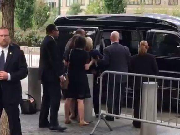 Μπροστά στις κάμερες η Κλίντον περπατούσε υποβασταζόμενη από τους άνδρες της ασφάλειας της και δεν φαινόταν καλά στην υγεία της. Μεταφέρθηκε άμεσα στο διαμέρισμα της κόρης της Τσέλσι που βρίσκεται στην Νέα Υόρκη.