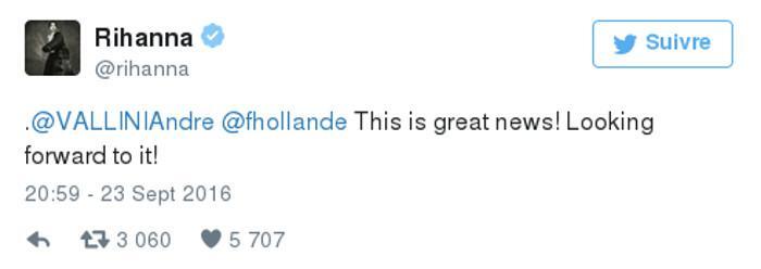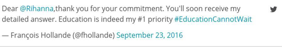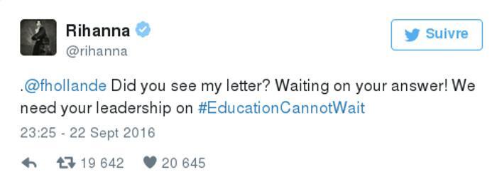 “@Ολάντ, λάβατε την επιστολή μου; Περιμένω απάντησή σας! Χρειαζόμαστε την ηγεσία σας όσον αφορά το πρόγραμμα ‘Education Cannot wait'”, είχε γράψει την Πέμπτη στο Twitter η 28χρονη τραγουδίστρια από τα Μπαρμπέιντος, η οποία έχει 65,9 εκατ. ακόλουθους σε αυτό το μέσο κοινωνικής δικτύωσης.