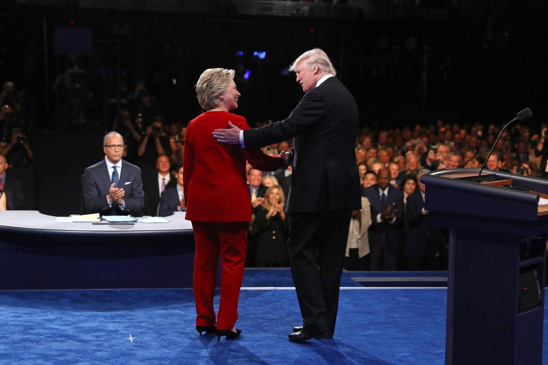 Ντυμένη στα κόκκινα η Χίλαρι Κλίντον και σε καλή κατάσταση παρά την πρόσφατη περιπέτεια της υγείας της αντάλλαξε μια χειραψία με τον Ντόναλντ Τραμπ που από την αρχή φάνηκε ότι ήταν έτοιμος… για όλα.