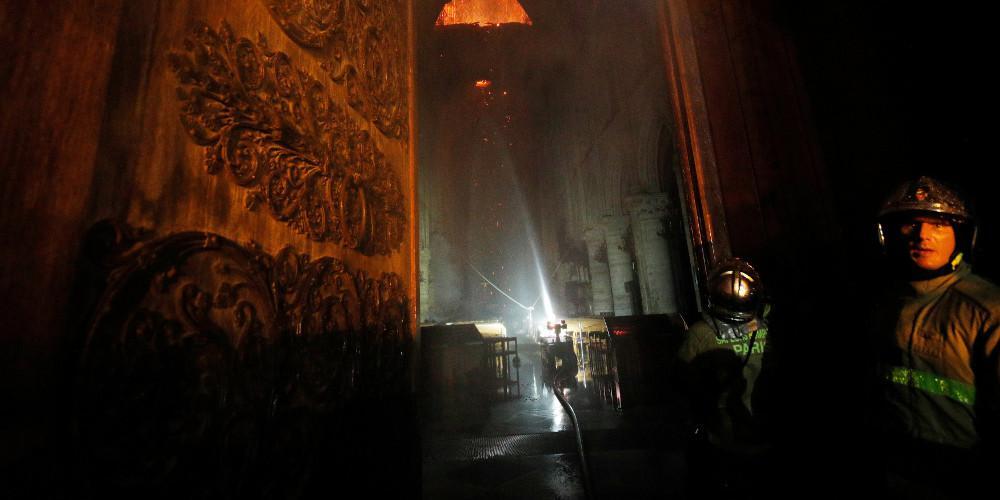 Το μεσημέρι της Τρίτης η πυροσβεστική υπηρεσία της του Παρισιού έδωσε στην δημοσιότητα ένα βίντεο περίπου δύο λεπτών το οποίο απεικονίζει τις υπεράνθρωπες προσπάθησες που έγιναν για να θέσουν την μεγάλη πυρκαγιά υπό έλεγχο. Η πυρκαγιά επεκτάθηκε γρήγορα στα ξύλινα υποστηρίγματα της οροφής του ναού, όπου εργάτες πραγματοποιούσαν εργασίες εκτεταμένης ανακαίνισης, καθώς και στο ξύλινο πλαίσιο του βέλους.