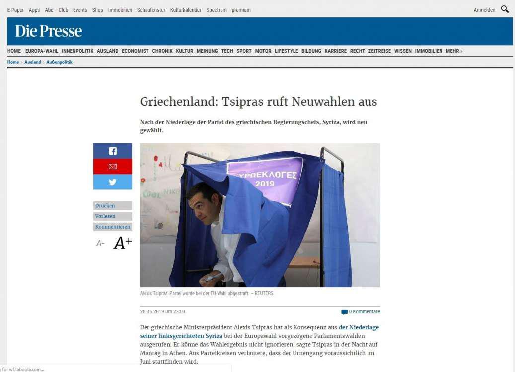 «Ο Τσίπρας ανακοίνωσε νέες εκλογές», είναι ο τίτλος της αυστριακής ιστοσελίδας, Die Presse.