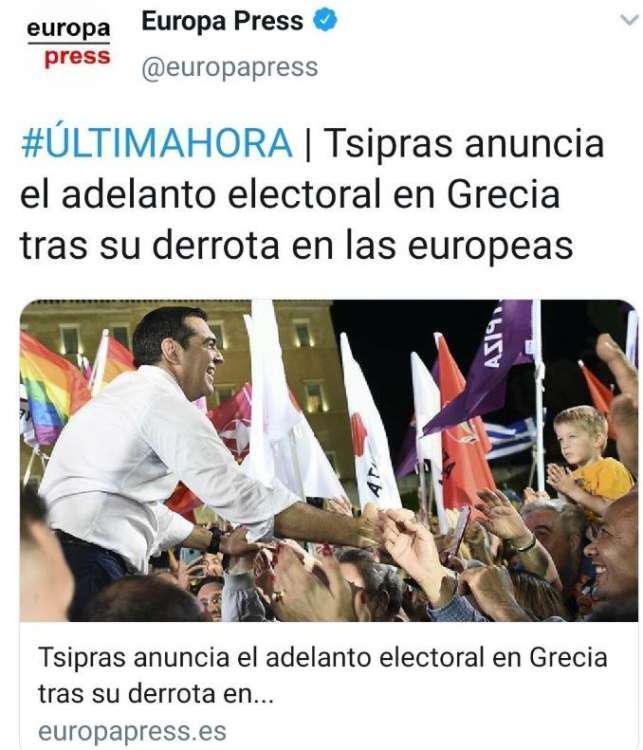 «Ο Τσίπρας ανακοίνωσε πρόωρες εκλογές στην Ελλάδα μετά την ήττα του στις ευρωεκλογές», αναφέρει σε ρεπορτάζ του ισπανικό πρακτορείο ειδήσεων, Europa Press.
