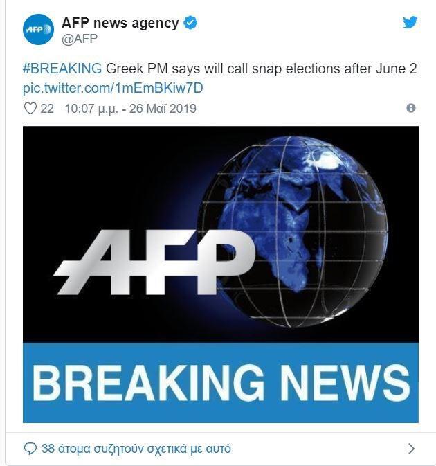 «Ο Τσίπρας προκήρυξε νέες εκλογές», αναφέρει με τη σειρά του το Sputnik, ενώ το γαλλικό πρακτορείο ειδήσεων, AFP, υπογράμμιζε ότι «ο Έλληνας Πρωθυπουργός ανακοίνωσε ότι θα κυρήξει εκλογές μετά τις 2 Ιουνίου».