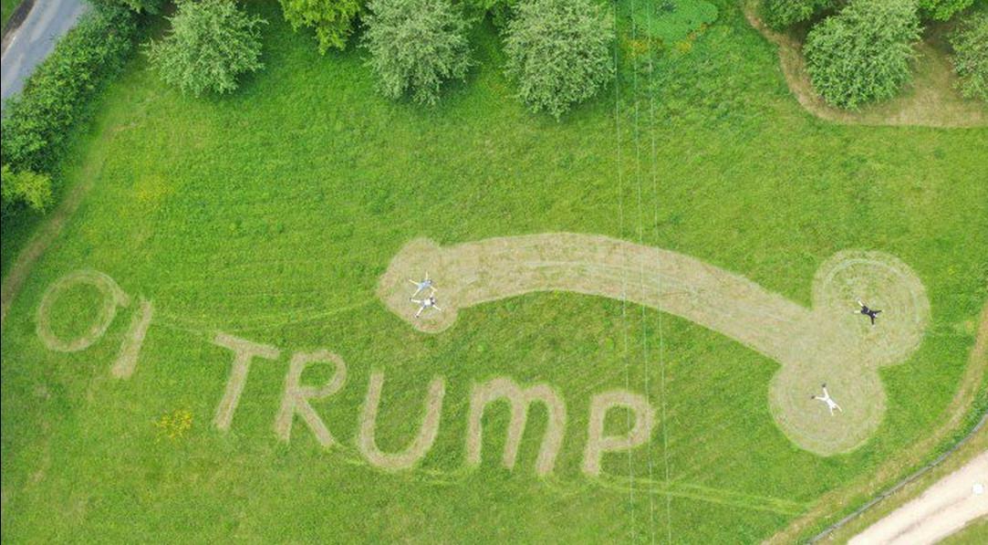Επίσης ένας 18χρονος Βρετανός σχημάτισε σε ένα λιβάδι δίπλα στο αεροδρόμιο του Στάνσεντ όπου προσγειώθηκε ο Τραμπ έναν φαλλό για να τον υποδεχτεί.