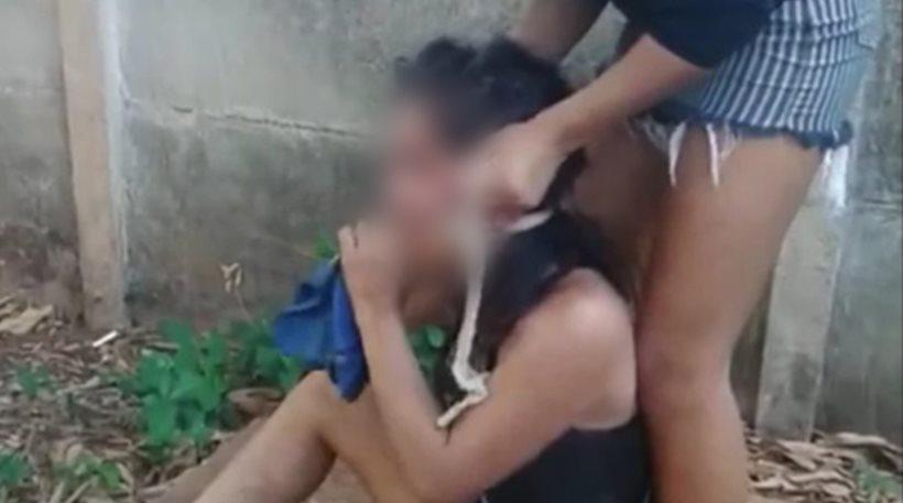 Οι νεαρές Βραζιλιάνες έχουν δέσει χειροπόδαρα την άτυχη 14 χρονη και της χτυπούν με ένα ραβδί, ενώ μια από αυτές την μαχαιρώνει πολλές φορές με μια ματσέτα.