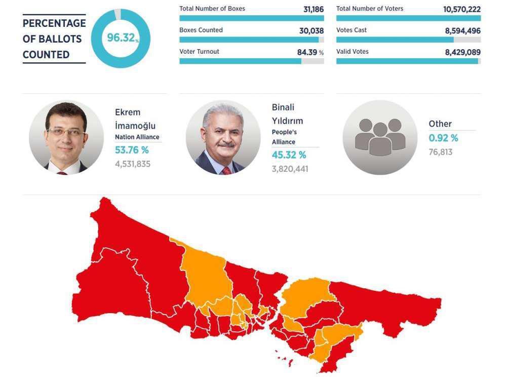 Με καταμετρημένο το 94,5% των ψήφων, ο Ιμάμογλου συγκεντρώνει το 53,64% έναντι 45,44% του Γιλντιρίμ.