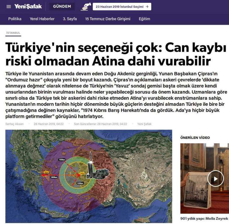 Επικαλούμενη τις δηλώσεις του Αλέξη Τσίπρα ότι «ο ελληνικός στρατός βρίσκεται σε ετοιμότητα για να υπερασπιστεί τα συμφέροντα της χώρας» και τη «συμμαχία» Ελλάδας – Κύπρου για τις γεωτρήσεις στην Ανατολική Μεσόγειο η Yeni Safak αναλύει τις επιχειρησιακές δυνατότητες της Τουρκίας, εφόσον δεχθεί επίθεση από την Ελλάδα ή πληγούν τα συμφέροντά της στην Ανατολική Μεσόγειο με ελληνική γεώτρηση.