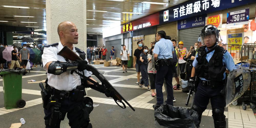 Στις εικόνες που μετέδιδε απευθείας το τηλεοπτικό κανάλι Now TV διακρίνεται ένας αστυνομικός να στοχεύει με το όπλο του τους συγκεντρωμένους που του πετούν διάφορα αντικείμενα, μέχρι που οπισθοχωρεί μαζί με τους συναδέλφους του.