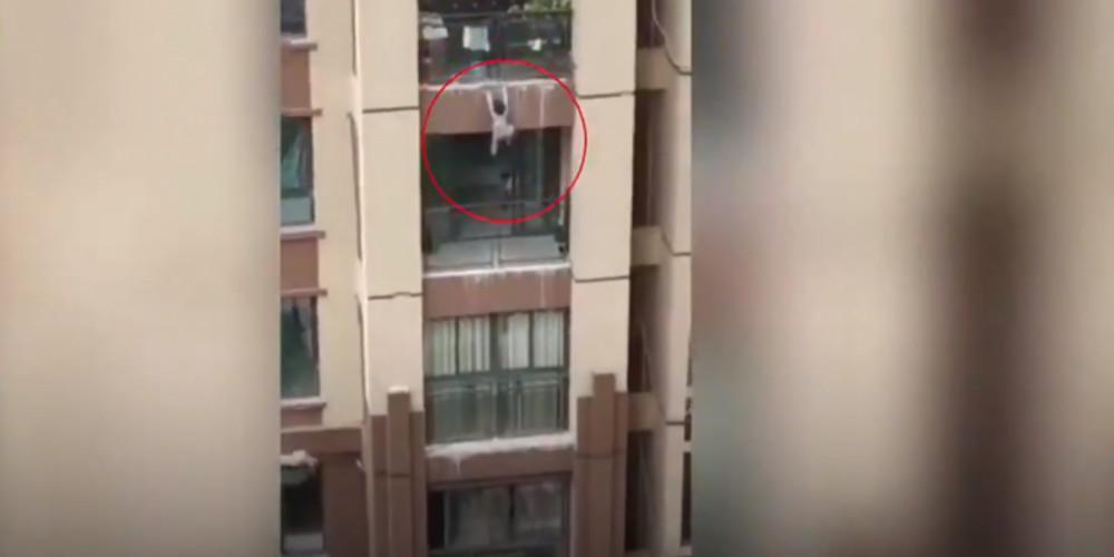 Στο βίντεο με το περιστατικό, που εκτυλίχθηκε τη Δευτέρα στην περιοχή Τσονγκίνγκ (νοτιοδυτική Κίνα), διακρίνεται το παιδάκι να κρέμεται στο κενό ενώ κρατιέται από το μπαλκόνι.