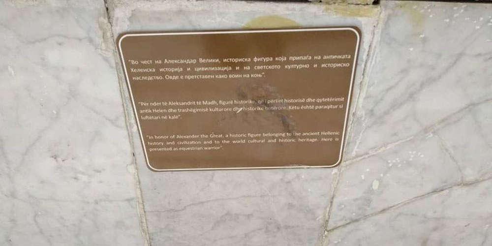 «Προς τιμήν του Μεγάλου Αλέξανδρου, ιστορική φυσιογνωμία που ανήκει στην αρχαία ελληνική ιστορία και πολιτισμό και στην παγκόσμια πολιτισμική και ιστορική κληρονομία. Εδώ απεικονίζεται ως έφιππος πολεμιστής», αναφέρεται χαρακτηριστικά. Ανάλογες επισημάνσεις τοποθετήθηκαν και κάτω από τα αγάλματα του Φίλιππου του Β’, και της μητέρας του Αλέξανδρου, Ολυμπιάδας.