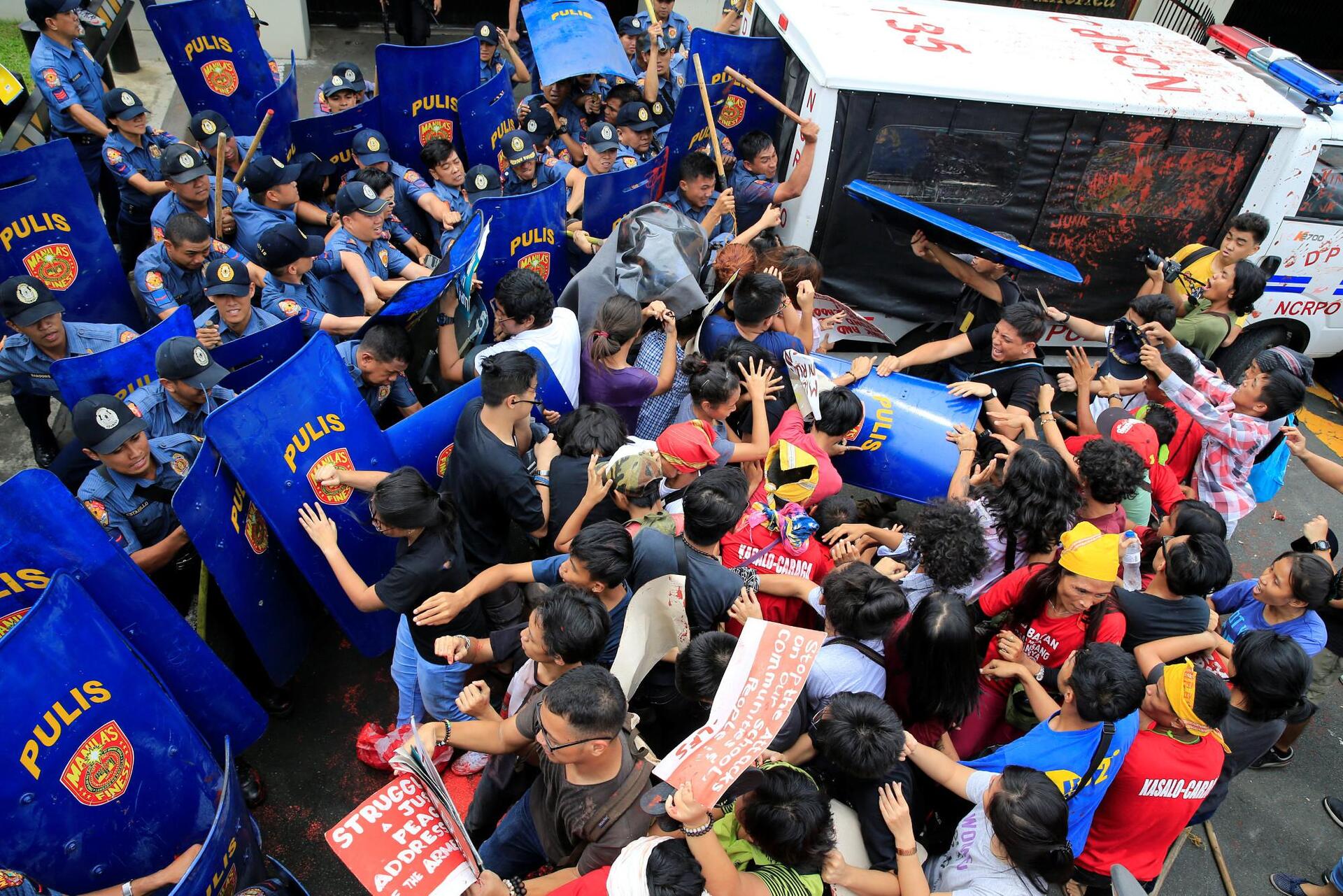 Τα βίαια επεισόδια ξέσπασαν όταν διαδηλωτές συγκεντρώθηκαν έξω από την αμερικανική πρεσβεία για να ζητήσουν την αποχώρηση των αμερικανικών στρατευμάτων από τη χώρα και για να υποστηρίξουν το αίτημα του προέδρου Ροντρίγο Ντουτέρτε για μια εξωτερική πολιτική που δεν θα εξαρτάται από τις ΗΠΑ, τον μακροχρόνιο εταίρο της χώρας.