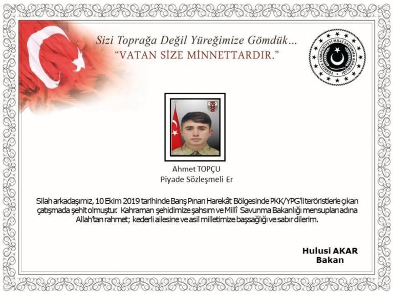 Πρόκειται για τον Αχμέτ Τοπτσού. Όπως ανακοίνωσε το τουρκικό υπουργείο Άμυνας: «Ο συμπολεμιστής μας στις 10 Οκτωβρίου 2019 έγινε μάρτυρας κατά την επιχείρηση “Πηγή Ειρήνης”κατά των τρομοκρατών του PKK. Εγώ προσωπικά (σ.σ. ο υπουργός Άμυνας Χουλουσί Ακάρ) και τα μέλη του υπουργείου Άμυνας ευχόμαστε ο Θεός να συγχωρέσει τον ήρωα. Εκφράζω τα συλλυπητήρια μου στην οικογένεια του».