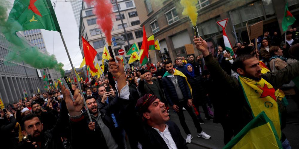 Οι διαδηλωτές κρατούσαν σημαίες της συροκουρδικής πολιτοφυλακής YPG και πλακάτ με μηνύματα που αποδοκίμαζαν οποιαδήποτε συνεργασία με το τουρκικό κυβερνών κόμμα Δικαιοσύνης και Ανάπτυξης AKP.