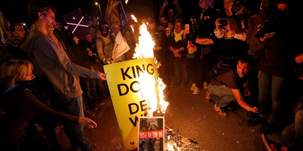 “Ο Ισπανός βασιλιάς δεν είναι ευπρόσδεκτος στην Καταλονία”, έγραφε το πανό ενός διαδηλωτή, ενώ άλλοι ύψωναν σημαίες της Καταλονίας και ανάποδες φωτογραφίες του μονάρχη.