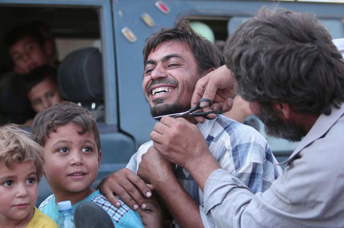 Λίγο αργότερα, σε άλλο σημείο του χωριού, παιδιά και ενήλικες έτρεχαν να σφίξουν τα χέρια των στρατιωτών για να τους ευχαριστήσουν, ενώ άλλοι ανέμιζαν λευκές σημαίες. Οι στρατιώτες είχαν μόλις σκοτώσει οχτώ μαχητές του ΙΚ, τους οποίους εντόπισαν κατά την έρευνά τους στο Gogjali.