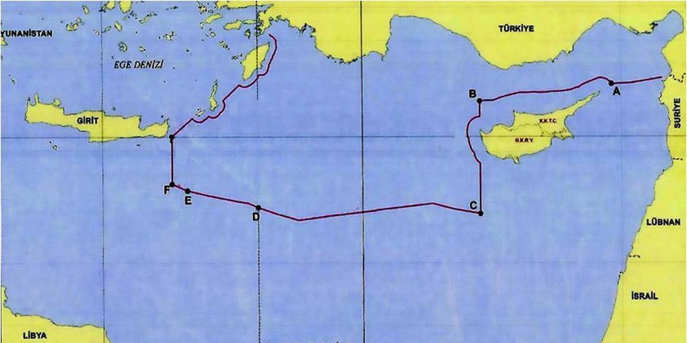 Τα σημεία που αναφέρονται στον χάρτη ως “εξωτερικά όρια στην Ανατολική Μεσόγειο” είναι τα εξής: A-Β: «Συμφωνία Τουρκίας-ΤΔΒΚ 2011». C-D-E: «Μέση γραμμή μεταξύ ενδοχώρας Αιγύπτου-Τουρκίας», E-F: «Συμφωνία Τουρκίας-Λιβύης».