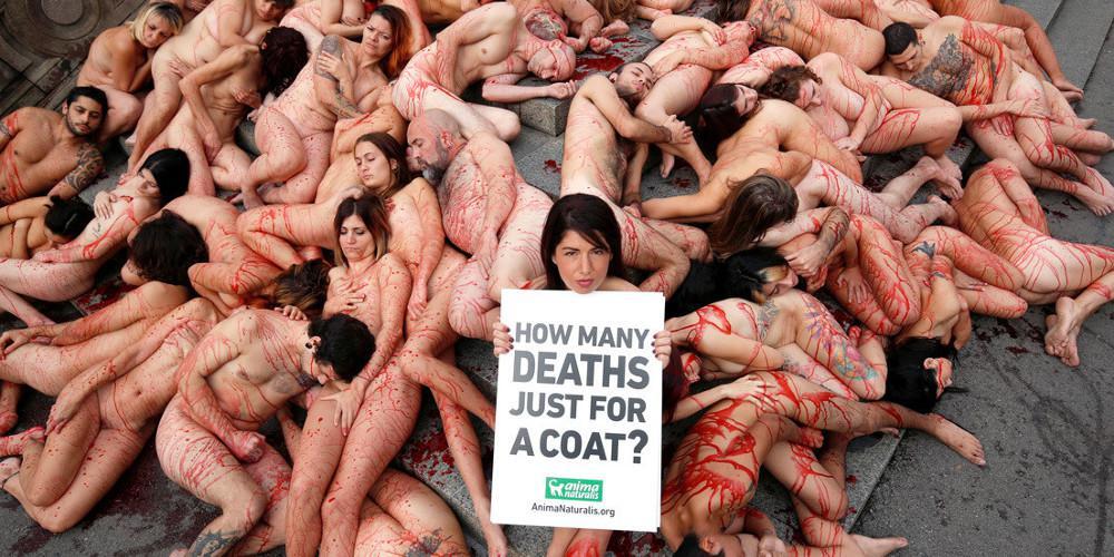 Σημειώνεται ότι η εκτροφή ζώων για γούνες έχει απαγορευτεί σε μια σειρά ευρωπαϊκών χωρών όπως η Βρετανία και η Γερμανία. Ανάμεσα στους ξαπλωμένους γυμνούς ακτιβιστιές βρισκόταν μια γυναίκα η οποία κρατούσε πλακάτ με τη φράση «το να υποφέρει κανείς δεν είναι κομψό».