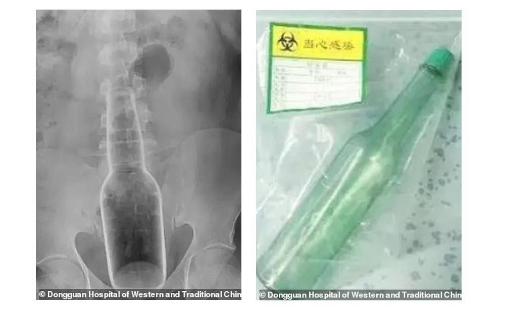 Ο κ. Wen εξετάστηκε από τον γιατρό Lin Jun, διευθυντή του Τμήματος Χειρουργικής του νοσοκομείου ο οποίος ανίχνευσε ένα σκληρό αντικείμενο περίπου δύο ίντσες από τον πρωκτό του. Στην συνέχεια έκανε ακτινογραφία, στην οποία φάνηκε ότι το αντικείμενο ήταν ένα μπουκάλι με τον γιατρό να προχωράει άμεσα σε επέμβαση ώστε να το αφαιρέσει από τον ασθενή.