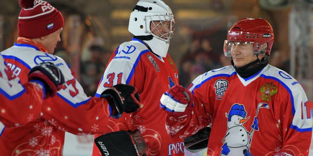 Στην ομάδα του, με την κόκκινη στολή, συμμετέχουν επίσης ο υπουργός Άμυνας Σεργκέι Σόιγκου, οι πρώην αστέρες του χόκεϊ Παβέλ Μπούρε, Βαλέρι Καμένσκι, Σεργκέι Φεντόροφ και άλλοι παίχτες.