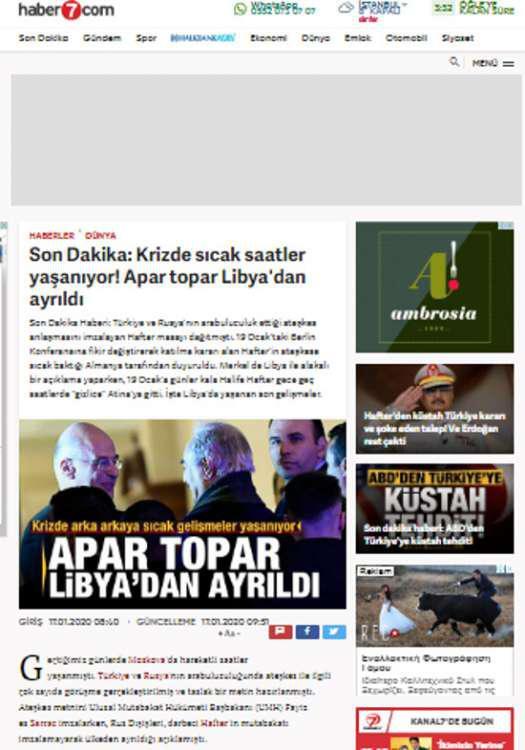 To Haber 7 γράφει ότι «ο πραξικοπηματίας Χαφτάρ πήγε στα κρυφά στην Ελλάδα».