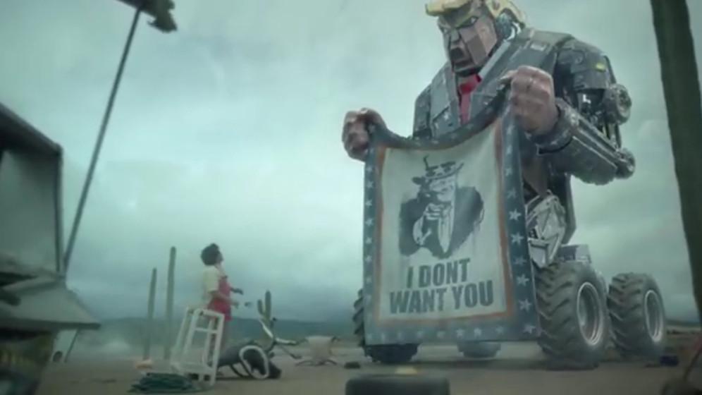 Στη συνέχεια, και αφού αρνούνται να πληρώσουν οι ίδιοι την κατασκευή του τείχους, κάνει έφοδο ένας γιγαντιαίος μεταλλικός Τραμπ αλά… «Μέγκαζορντ», με χειριστή του μηχανήματος τον ίδιο τον νεοεκλεγέντα πρόεδρο και αρχίζει να ποδοπατά τους Μεξικανούς απελαθέντες.