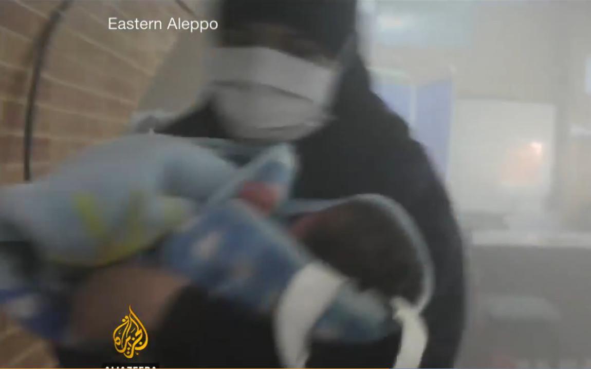 Επικρατεί πανικός. Κανείς δεν γνωρίζει πως να προφυλαχτεί, ενώ τα πάντα καταρρέουν γύρω τους. Γυναίκες σφίγγουν τα μικρά παιδιά στην αγκαλιά τους, ενώ λειτουργούν μόνο τα φώτα έκτακτης ανάγκης. Νοσοκόμες μεταφέρουν νεογνά τυλιγμένα πρόχειρα σε κουβέρτες. Πολλά παιδιά νοσηλεύονταν στο συγκεκριμένο κτίριο ως θύματα δηλητηρίασης από χημικά που είχαν χρησιμοποιηθεί και άλλα με τραύματα από προηγούμενους βομβαρδισμούς.