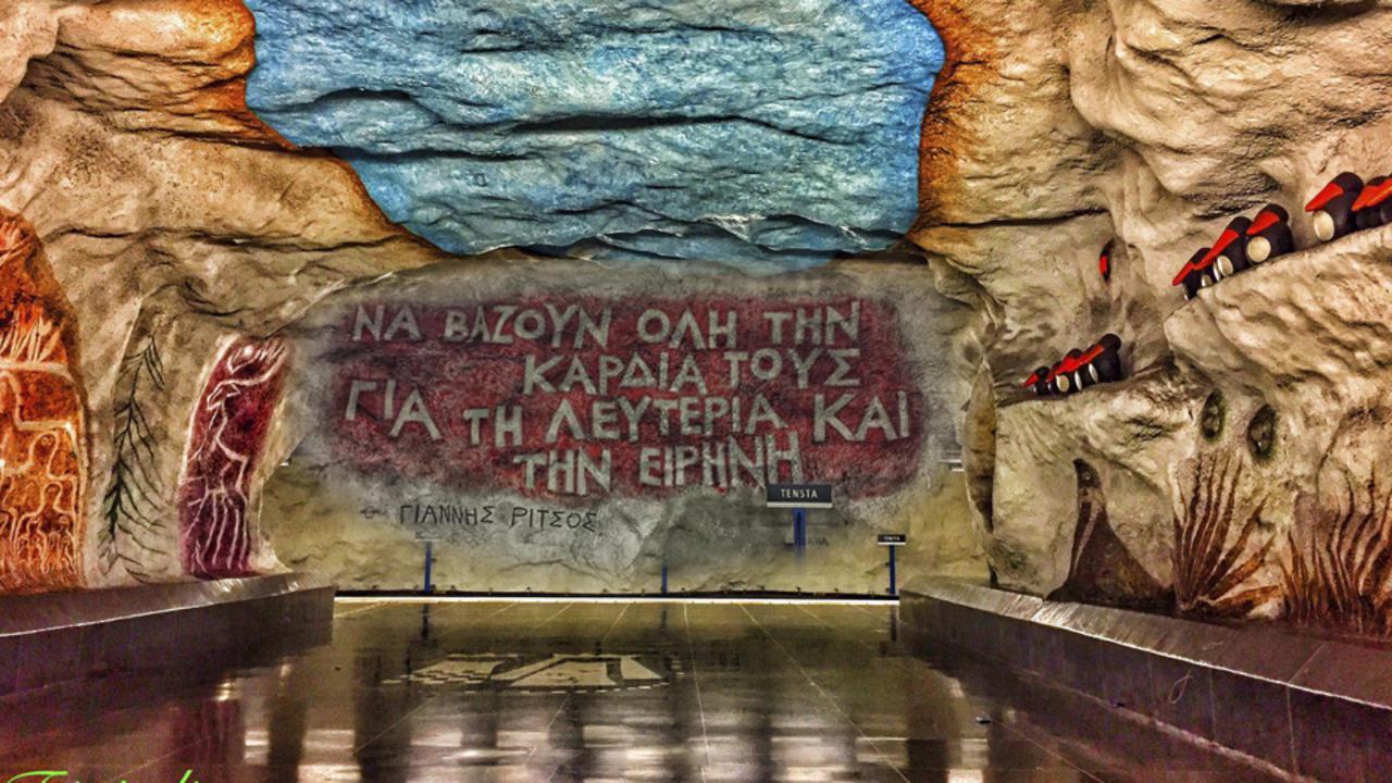 Η συγκεκριμένη τοιχογραφία βρίσκεται στον σταθμό Tensta και είναι ένα μέρος του ποιήματος του Γιάννη Ρίτσου «Γράμμα στον Ζολιό – Κιουρί».