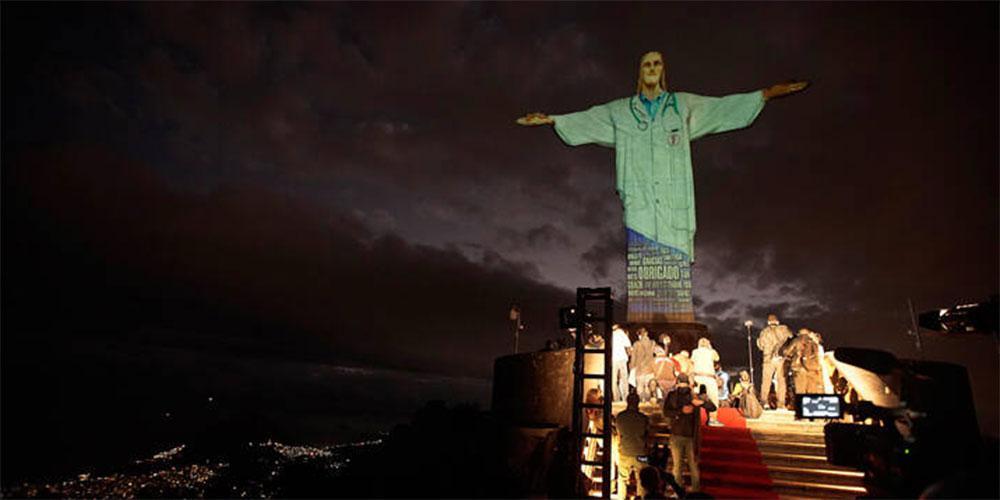 Το άγαλμα που δεσπόζει σε λόφο της βραζιλιάνικης πόλης φωτίστηκε για να τιμήσει το υγειονομικό προσωπικό που εργάζεται στα νοσοκομεία.