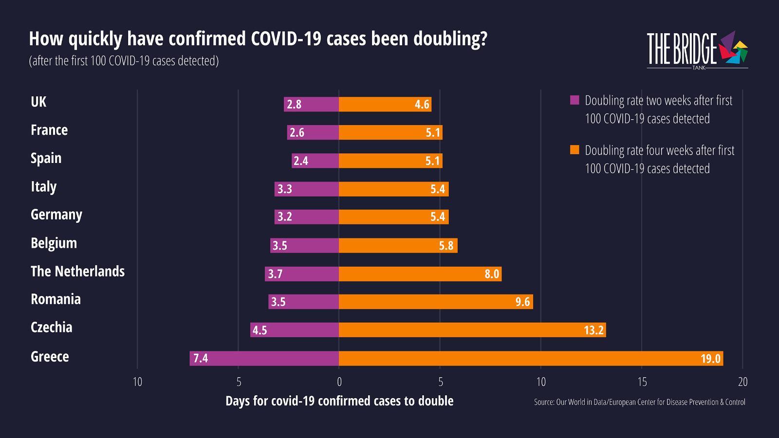 Ο πρόεδρος του Bridge Tank, Joel Ruet δήλωσε ότι τέσσερις εβδομάδες μετά τον εντοπισμό των πρώτων 100 κρουσμάτων COVID-19 σε κάθε χώρα, χρειάστηκαν 19 ημέρες για να διπλασιαστεί ο αριθμός των κρουσμάτων στην Ελλάδα, το οποίο είναι μια ξεκάθαρη ένδειξη ότι η Ελλάδα κατάφερε με επιτυχία την επιπέδωση της επιδημικής καμπύλης. Στο άλλο άκρο του φάσματος, προσθέτει ότι το Ηνωμένο Βασίλειο εμφανίζει ακόμη ραγδαία αύξηση των επιβεβαιωμένων κρουσμάτων.