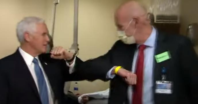 Ο Πενς, που επισκέφθηκε το προσωπικό του νοσοκομείου και ασθενείς, ήταν ο μόνος που δεν φόρεσε μάσκα σε μια αίθουσα γεμάτη κόσμο.