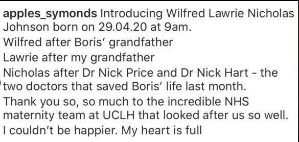 Συγκεκριμένα, η αρραβωνιαστικιά του Βρετανού πρωθυπουργού δημοσίευσε μια φωτογραφία της με το βρέφος στη λεζάντα της οποίαν ανέφερε ότι το παιδί θα πάρει τα ονόματα των παππούδων τους ζευγαριού. Ενώ ο Τζόνσον επέλεξε να προσθέσει και το «Νίκολας» για να τιμήσει τους γιατρούς που τον περιέθαλψαν ενώ είχε νοσήσει από τον κορωνοϊό, τους Δρ. Nick Price Δρ. Nick Hart.