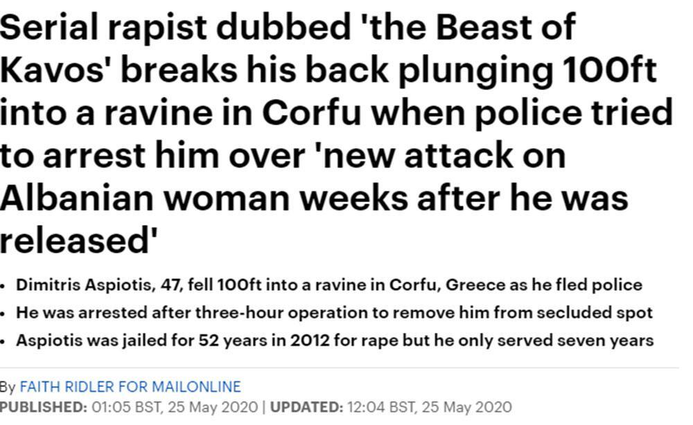 «Χωρίς προηγούμενη προειδοποίηση σε οποιαδήποτε από τις γυναίκες που είχε επιτεθεί, ο δράστης βγήκε από τη φυλακή για να ζήσει ξανά στον Κάβο της Κέρκυρας, παρότι οι ελληνικές Αρχές ισχυρίζονται ότι ο βιαστής δεν θα απελευθερωνόταν με αναστολή έως ότου έφτανε τα 92 χρόνια», αναφέρει για την υπόθεση η Daily Mail που υπενθυμίζει ότι ένα από τα θύματά του, η Κέιλ Μόργκαν, η οποία αποκάλυψε πέρυσι την ταυτότητά της προκειμένου να στραφεί ενάντια στην απόφαση της αποφυλάκισής του.