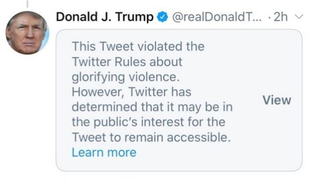 Στη θέση της ανάρτησης του Αμερικανού προέδρου αυτή τη στιγμή αναγράφεται η ανακοίνωση της εταιρείας Twitter: “Αυτό το Tweet παραβίασε τους Κανόνες του Twitter σχετικά με τον εγκωμιασμό πράξεων βίας. Ωστόσο, το Twitter έκρινε ότι το Tweet μπορεί να παραμείνει προσβάσιμο για λόγους δημόσιου συμφέροντος”.