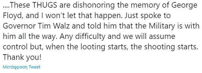 “Αυτά τα κακοποιά στοιχεία αμαυρώνουν τη μνήμη του Τζορτζ Φλόιντ και δεν θα επιτρέψω αυτό να συμβεί. Μόλις μίλησα με τον κυβερνήτη Tim Walz και του είπα ότι ο Στρατός είναι μαζί του. Οποιαδήποτε δυσκολία προκύψει θα έχουμε τον έλεγχο, αλλά, όταν ξεκινούν οι λεηλασίες, ξεκινούν και οι πυροβολισμοί. Ευχαριστώ!”