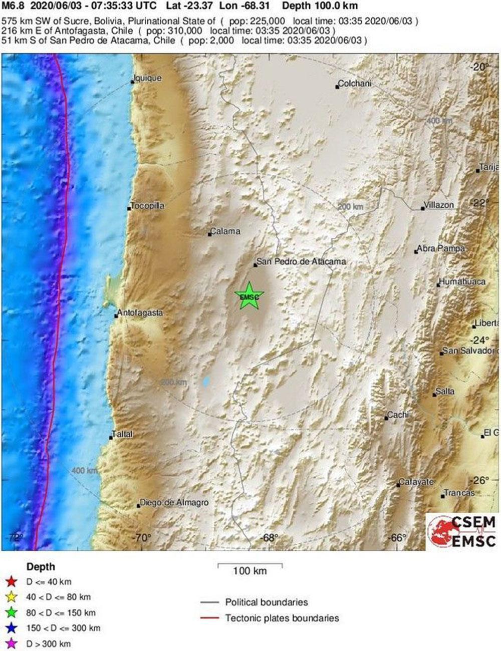 Σύμφωνα με το Ευρωμεσογειακό Σεισμολογικό Κέντρο, το επίκεντρο του σεισμού εντοπίζεται 51 χιλιόμετρα νότια του Σαν Πέδρο ντε Ατακάμα και το εστιακό βάθος υπολογίστηκε στα 100 χλμ..