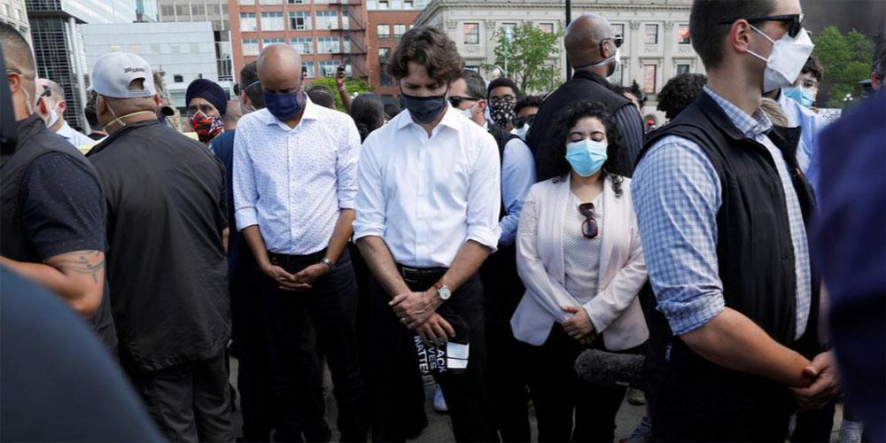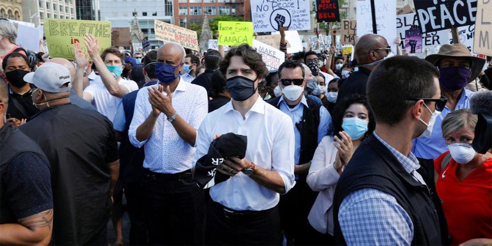 Φορώντας μαύρη μάσκα, λευκό πουκάμισο και μαύρο παντελόνι, περιτριγυρισμένος από σωματοφύλακες, ο φιλελεύθερος πρωθυπουργός έκανε μια εμφάνιση έκπληξη στη διαδήλωση στην Οτάβα με κεντρικό σύνθημα «Καμία δικαιοσύνη, Καμία ειρήνη» που πραγματοποιήθηκε μπροστά από το Κοινοβούλιο, μετά τη δολοφονία του Τζορτζ Φλόιντ στις ΗΠΑ.