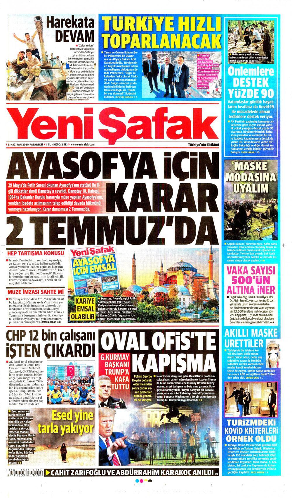 Σε πρωτοσέλιδο άρθρο της τουρκικής εφημερίδας Yeni Şafak, γίνεται λόγος ότι στις 2 Ιουλίου αναμένεται η απόφαση για την Αγία Σοφία.