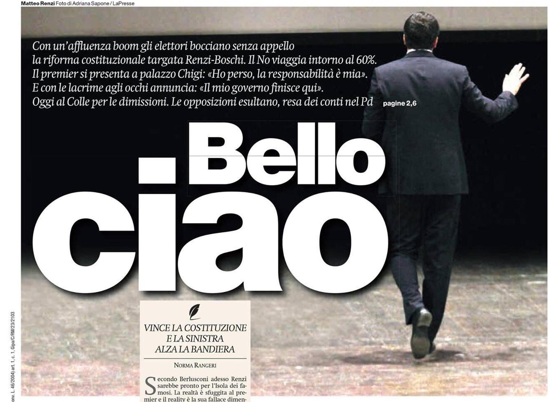 «Bello Ciao» (Αντίο όμορφε) γράφει στο πρωτοσέλιδό της η ιταλική «Ιl manifesto» με τον Ματέο Ρέντσι να είναι γυρισμένος πλάτη.