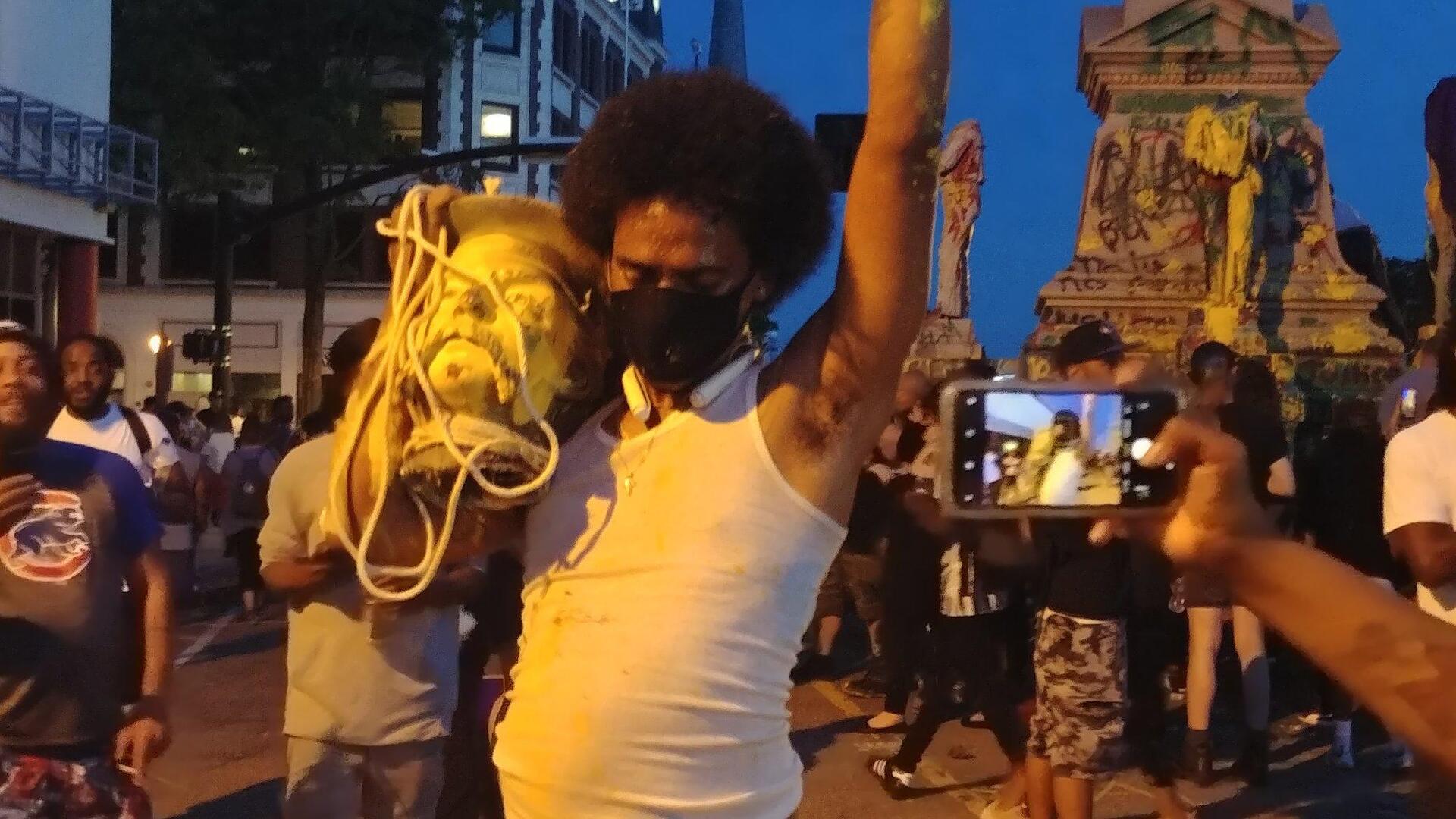Σύμφωνα με τον Independent οι διαδηλωτές αποκεφάλισαν τέσσερα αγάλματα και στη συνέχεια γκρέμισαν εντελώς το ένα από αυτά με σκοινί.