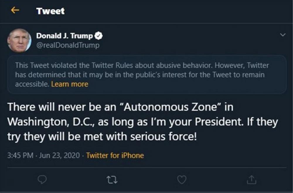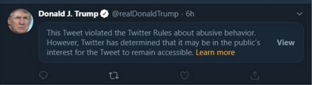 Η εταιρεία έκρυψε το tweet του Τραμπ επικαλούμενη απειλή βλάβης εναντίον μιας αναγνωρίσιμης ομάδας, όπως ανέφερε η εταιρεία. Κατέστησε ωστόσο προσβάσιμη την ανάρτηση για λόγους «δημόσιου συμφέροντος».