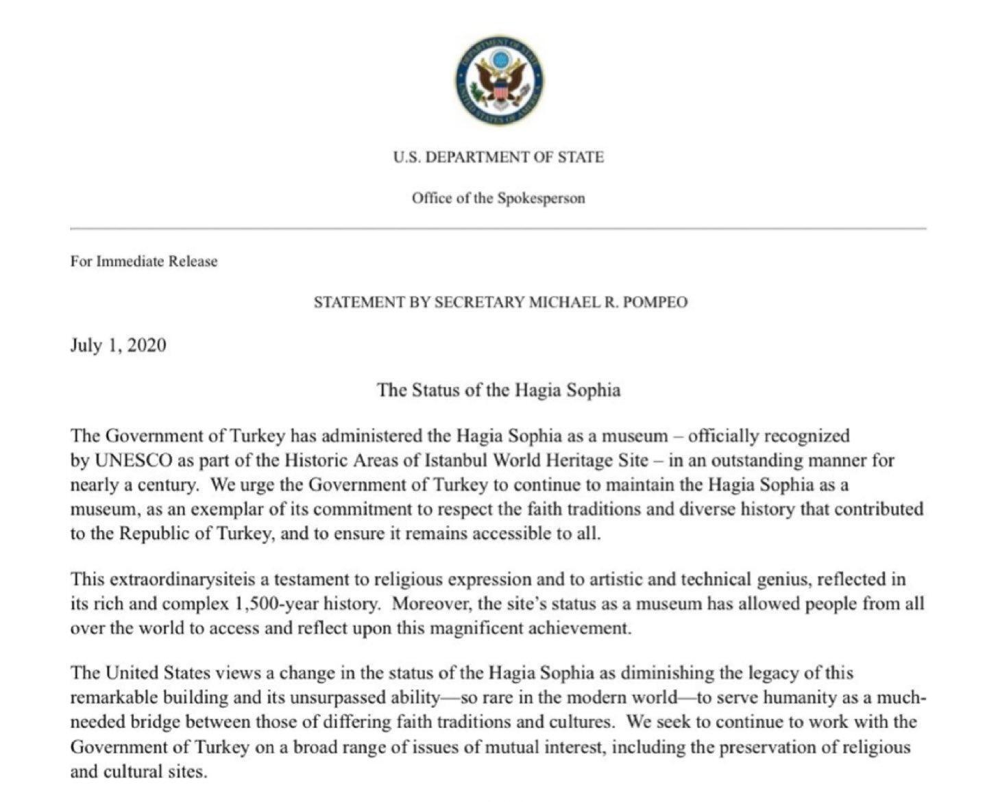 Ο Μάικ Πομπέο καλεί την τουρκική κυβέρνηση να διατηρήσει το υπάρχον καθεστώς της και να μην τη μετατρέψει σε μουσουλμανικό τέμενος τονίζοντας: «Προτρέπουμε την κυβέρνηση της Τουρκίας να συνεχίσει να διατηρεί την Αγία Σοφία ως μουσείο, ως παράδειγμα της δέσμευσής της να σέβεται τις θρησκευτικές παραδόσεις και τη διαφορετική ιστορία που συνέβαλε στην Τουρκική Δημοκρατία και να διασφαλίσει ότι παραμένει προσβάσιμη από όλους.