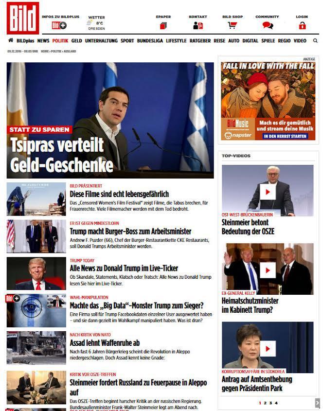 Αντί για λιτότητα, ο Έλληνας πρωθυπουργός, Αλέξης Τσίπρας, σπάει τη συμφωνία για το ευρωπαϊκό πακέτο βοήθειας, όπως σχολιάζει άρθρο της γερμανικής εφημερίδας «Bild» αναφερόμενο στα μέτρα πoυ ανακοίνωσε στο χθεσινό του διάγγελμα. Ο Τσίπρας μοιράζει χρηματικά δώρα αντί για λιτότητα, προσθέτει η «Bild».