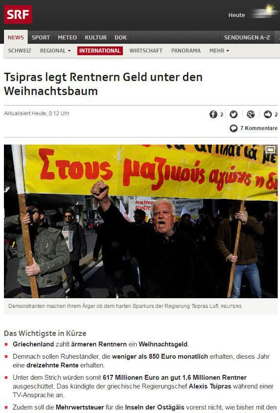 Ο Τσίπρας βάζει χρήματα κάτω από το χριστουγεννιάτικο δέντρο των συνταξιούχων, γράφει η ελβετική εφημερίδα SRf, επισημαίνοντας ότι ο Έλληνας πρωθυπουργός δίνει χρήματα στους φτωχούς συνταξιούχους.