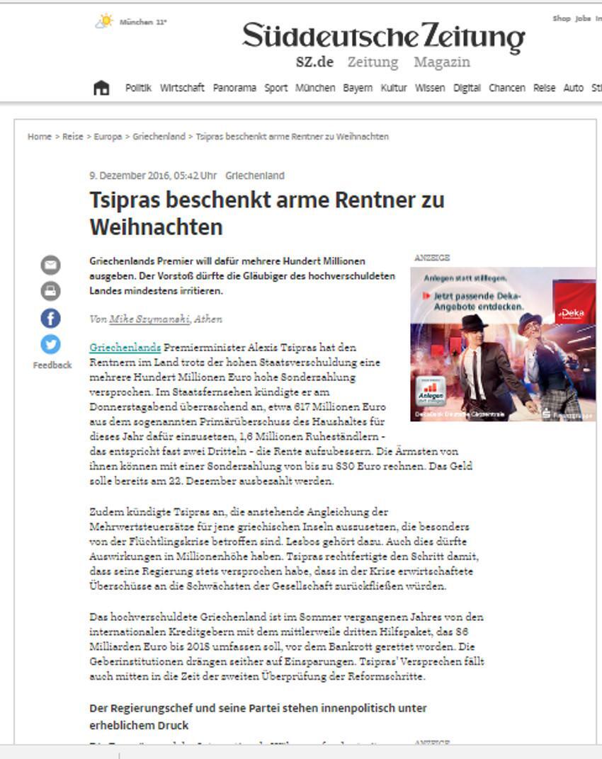 Η εφημερίδα Süddeutsche Zeitung του Μονάχου σημειώνει ότι «παρά το υψηλό κρατικό χρέος ο Αλέξης Τσίπρας εξήγγειλε βοήθεια σε 1,6 εκατ. χαμηλοσυνταξιούχους ύψους 617 εκατ. ευρώ, από το φετινό πρωτογενές πλεόνασμα και το πάγωμα της αύξησης του ΦΠΑ στα νησιά που δέχονται τους περισσότερους πρόσφυγες. Και αυτό το μέτρο θα αποτυπωθεί σε πολλά εκατομμύρια ευρώ».